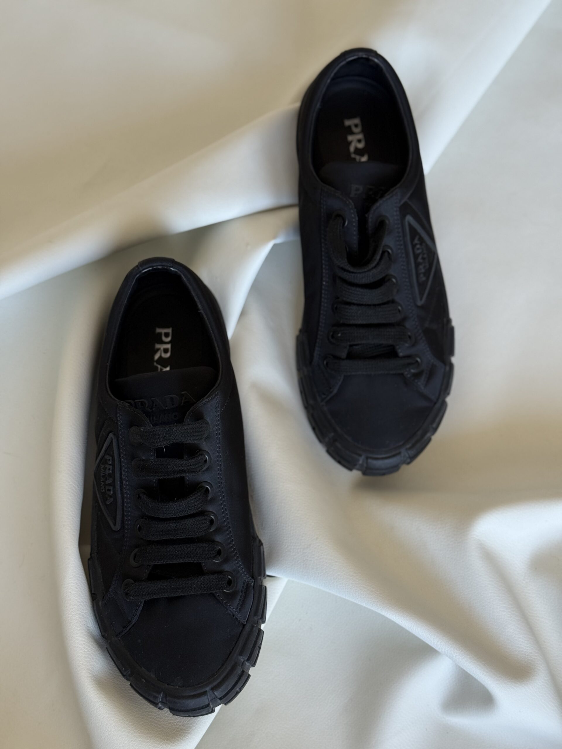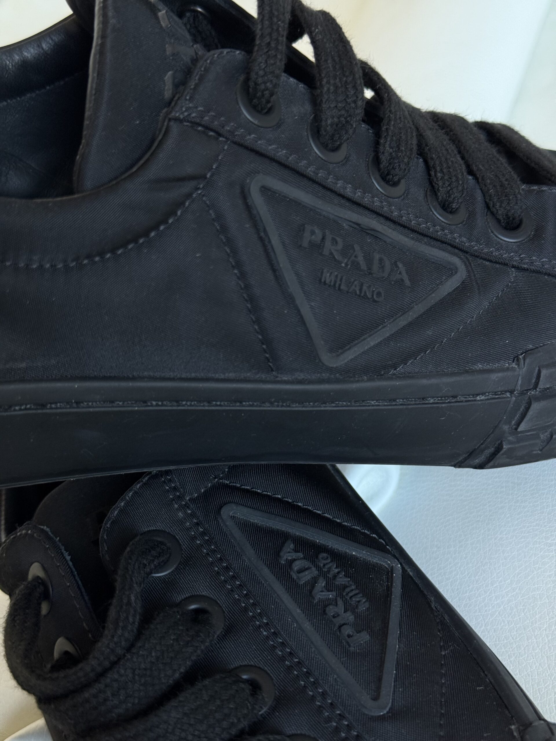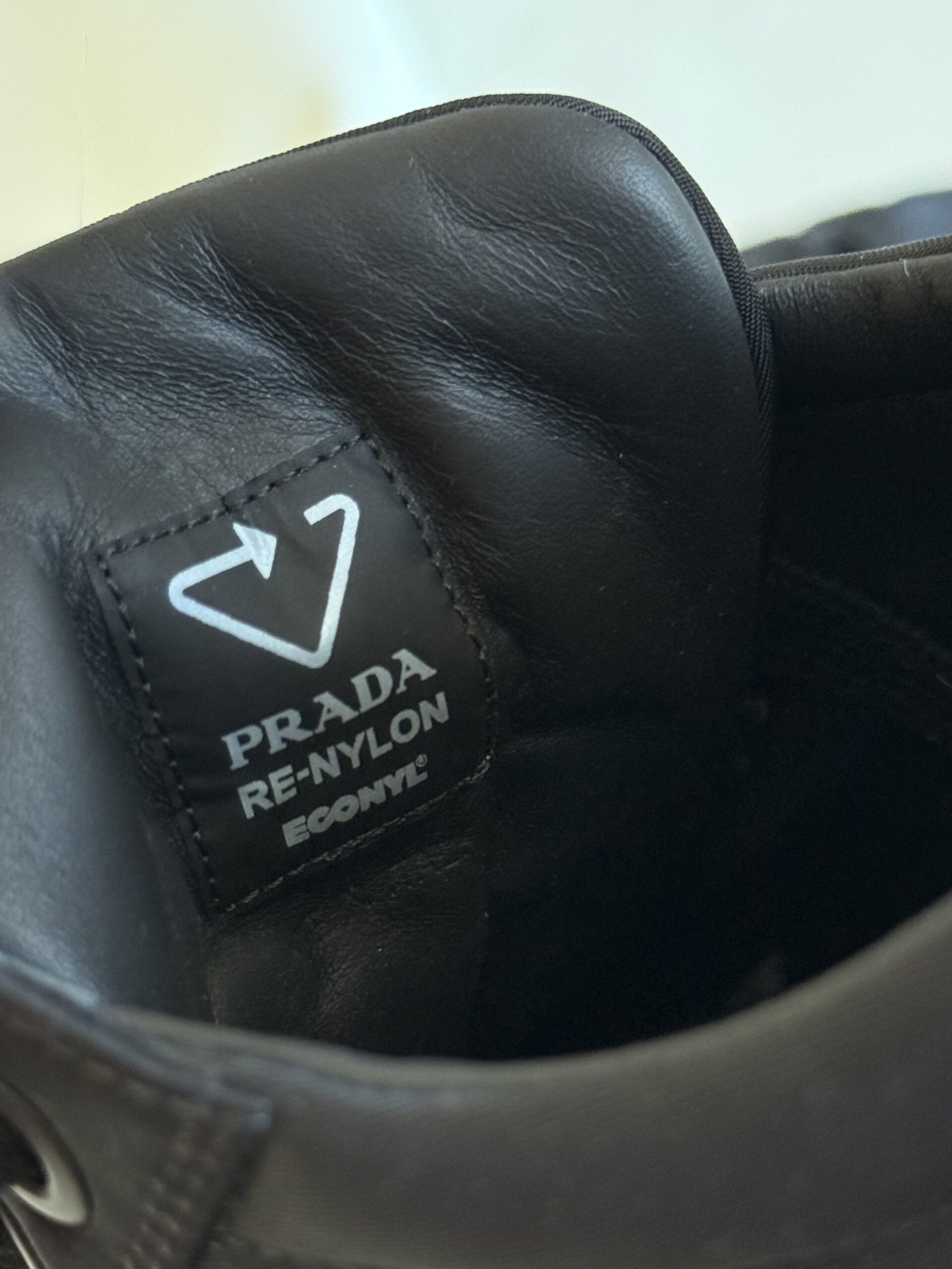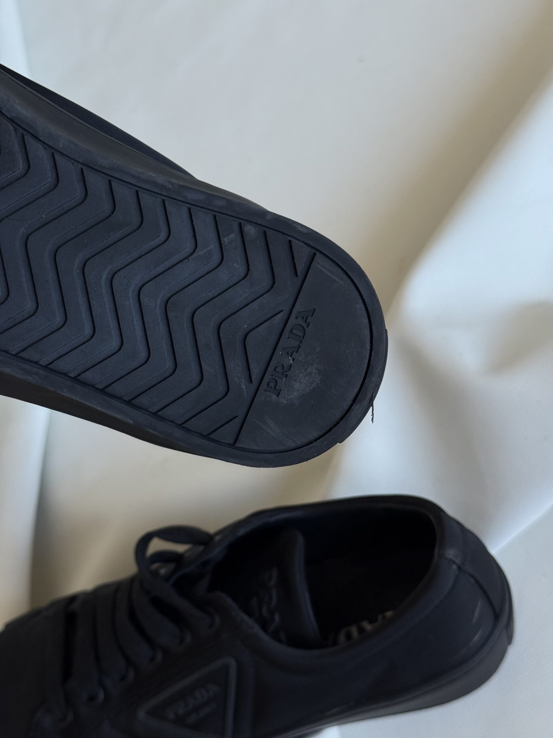 - Dettagli: Design minimal con punta arrotondata, suola spessa in gomma con logo triangolare Prada Milano in rilievo
