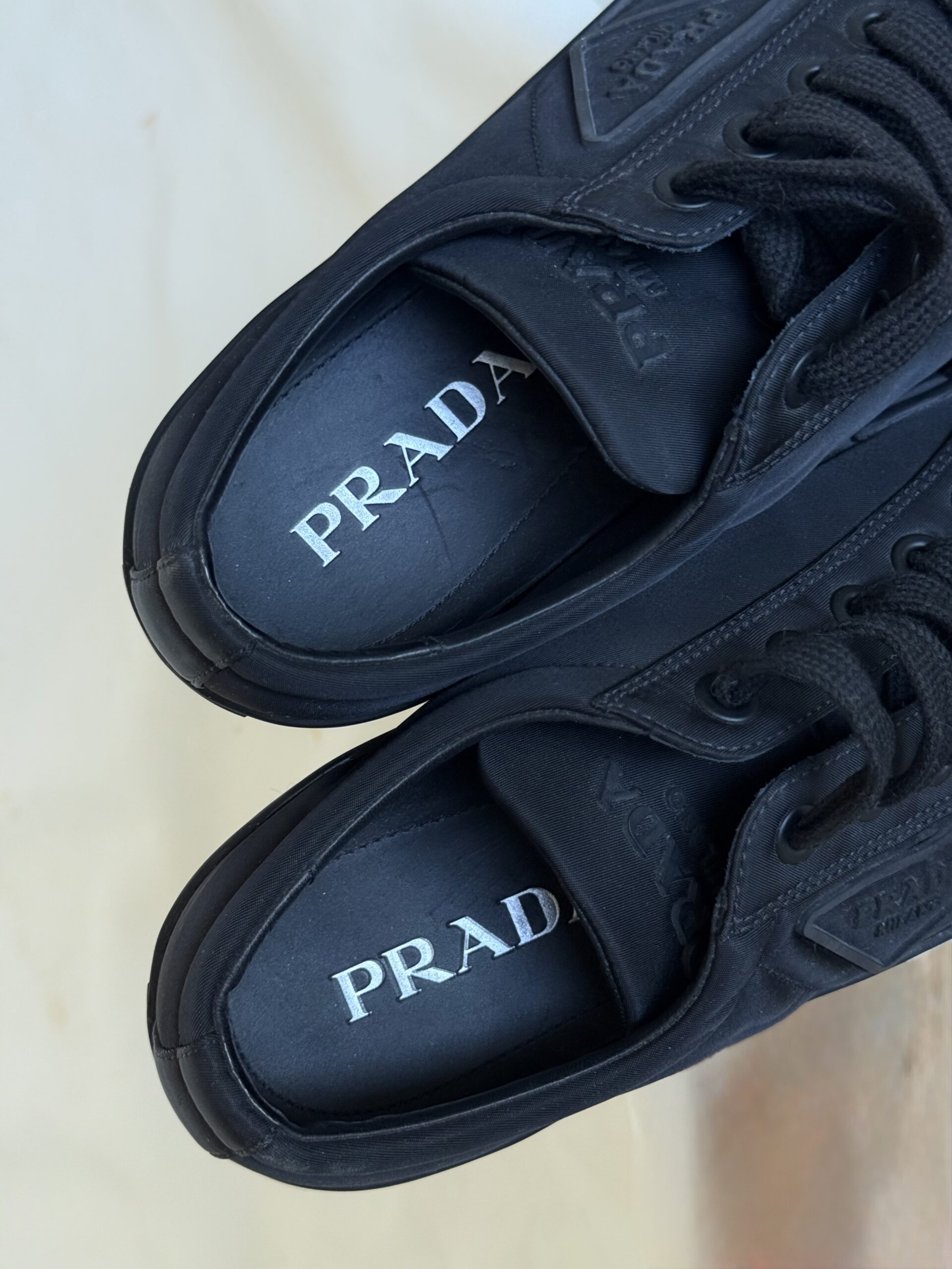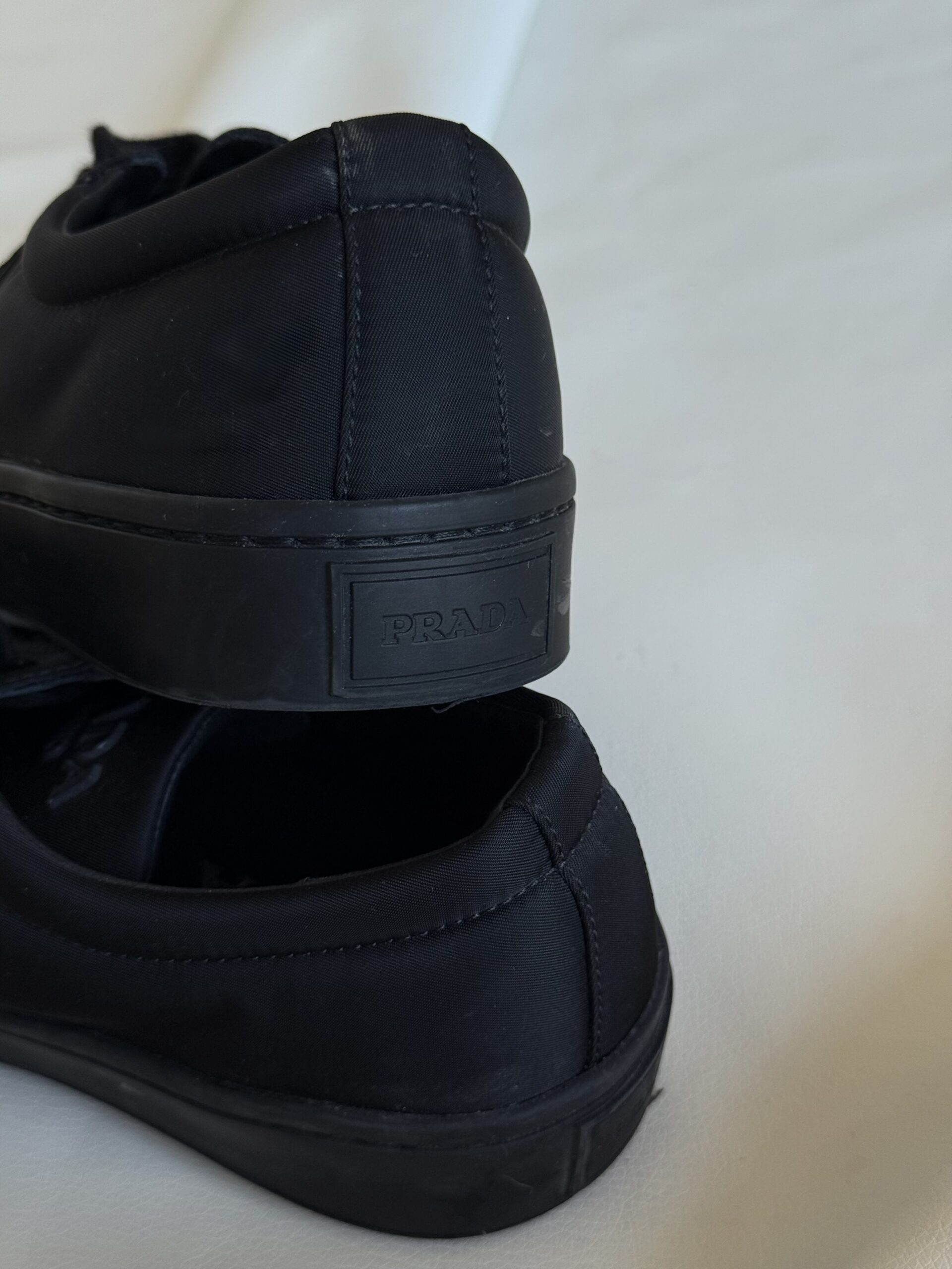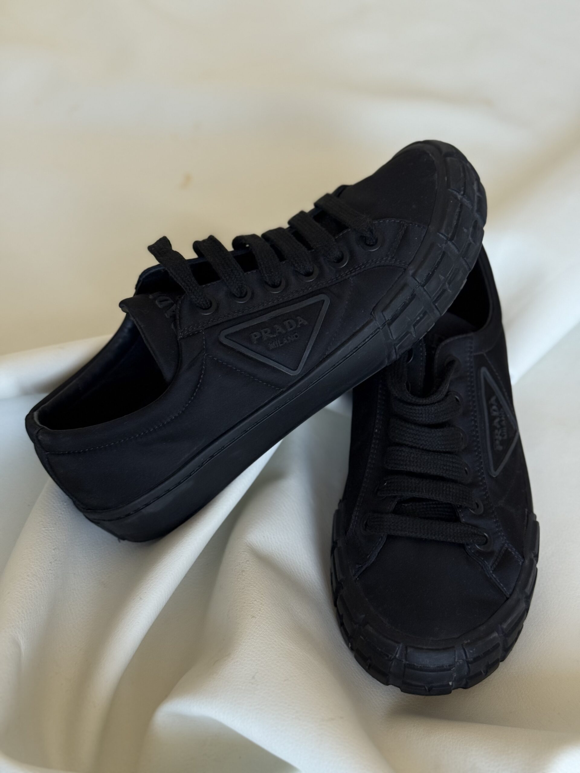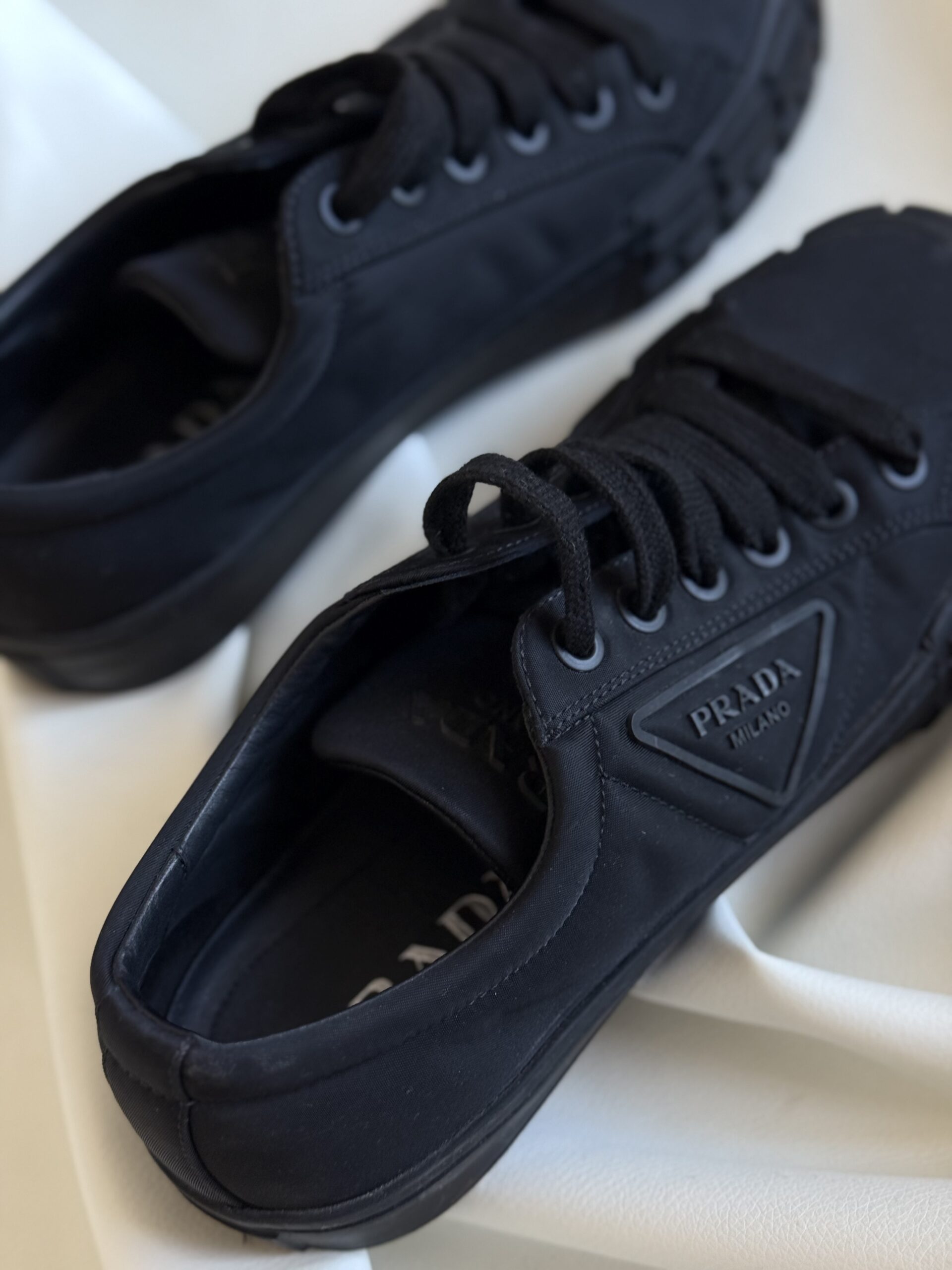 - Dettagli: Design minimal con punta arrotondata, suola spessa in gomma con logo triangolare Prada Milano in rilievo