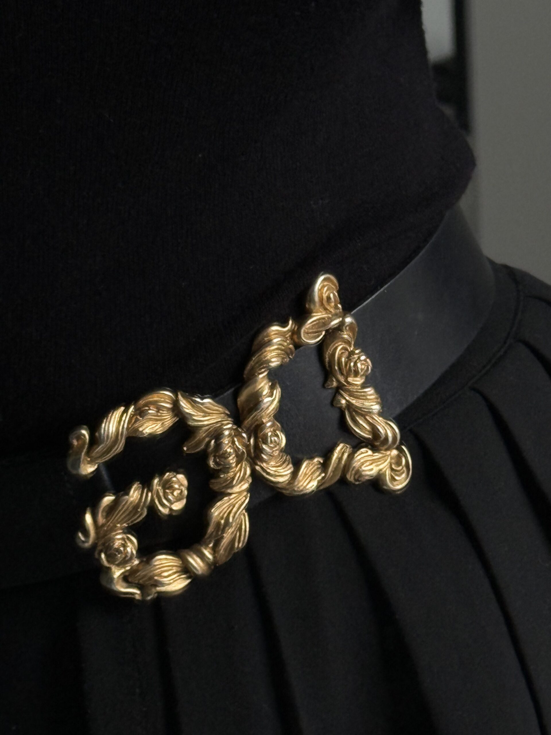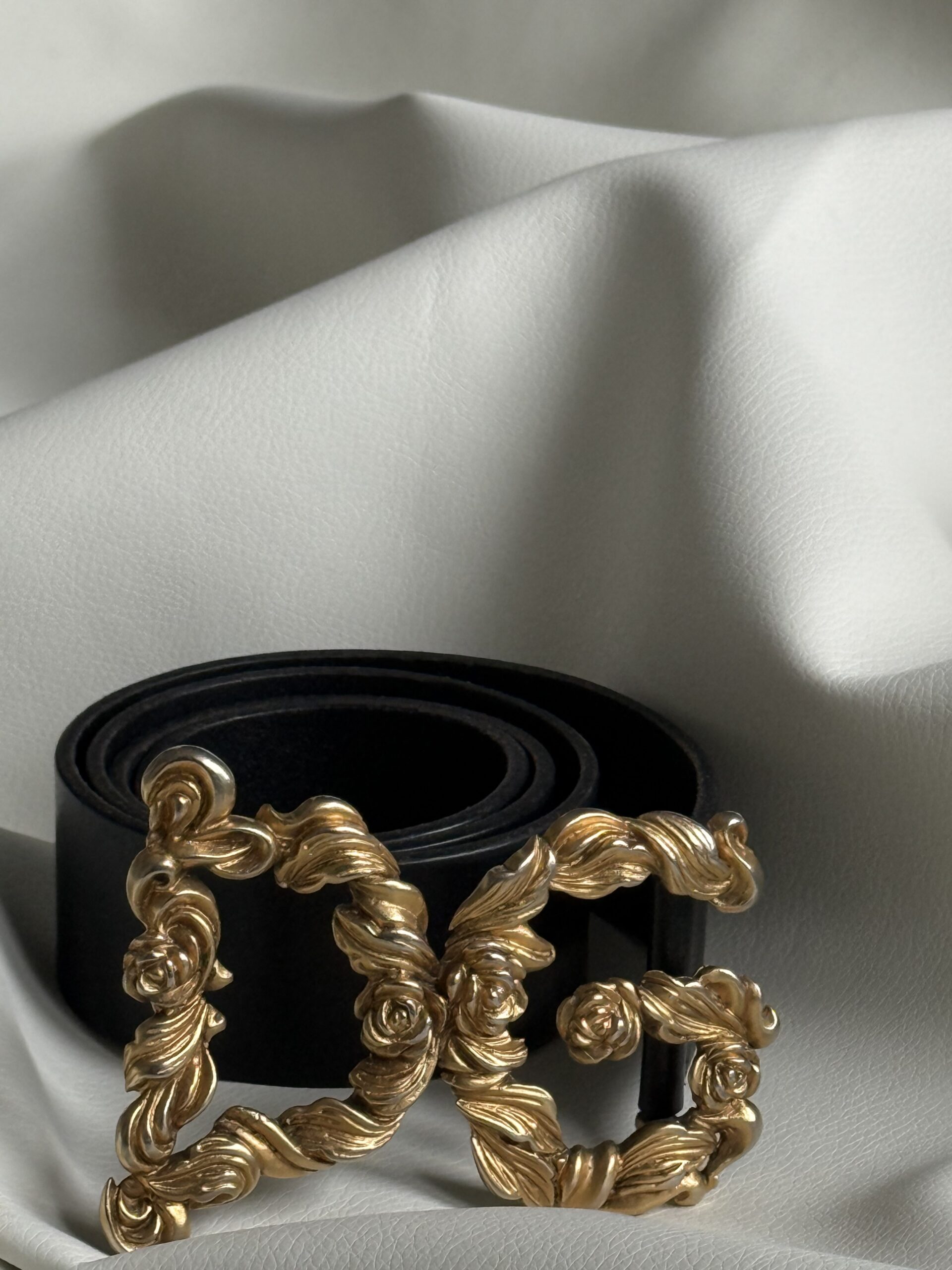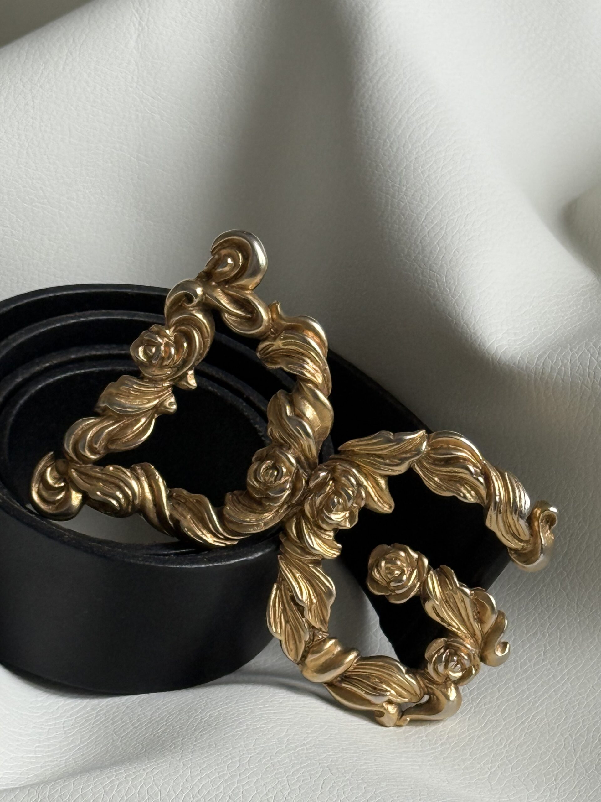 - Fibbia: Metallo color oro, design barocco con motivi floreali e linee scolpite
