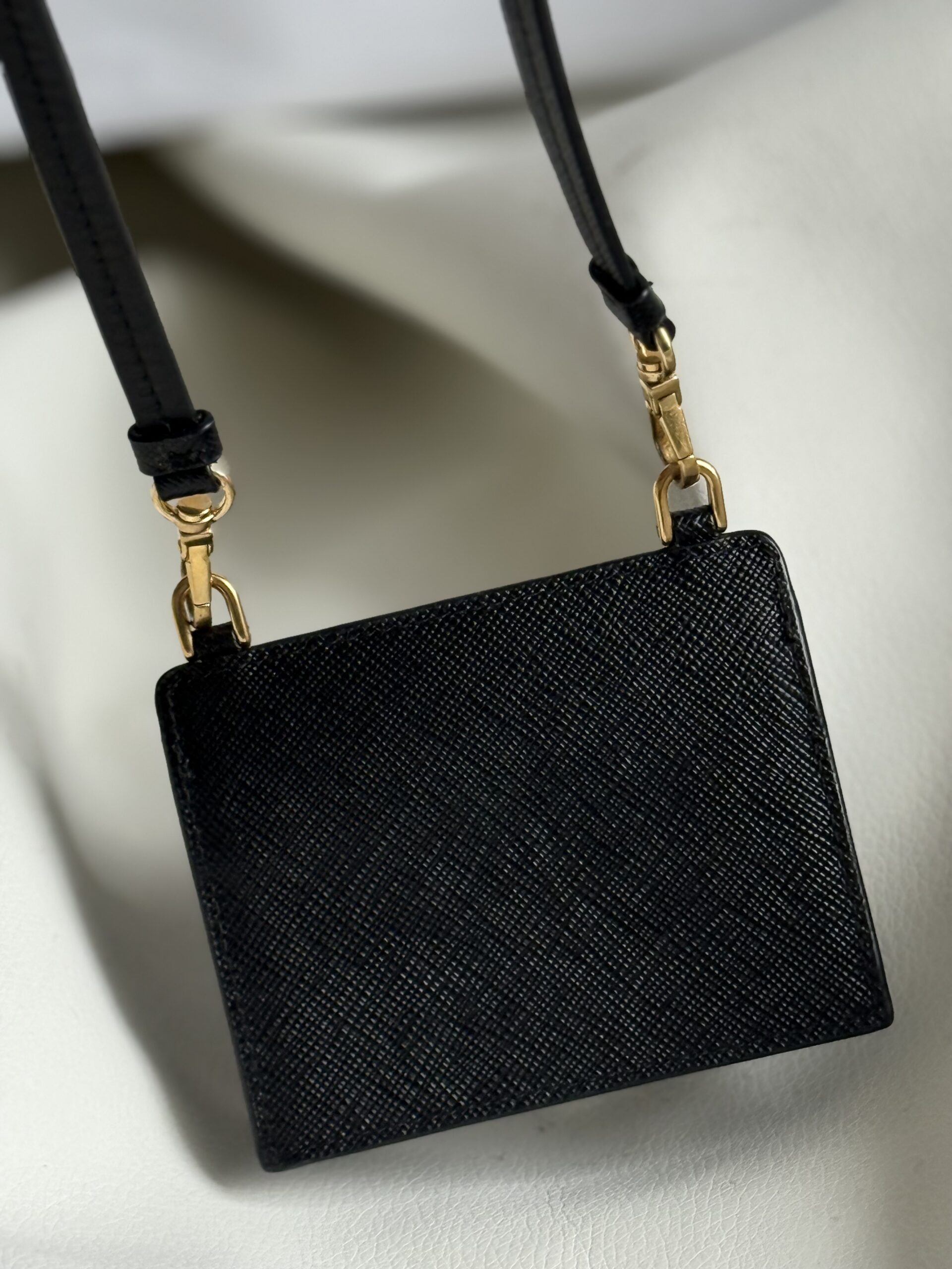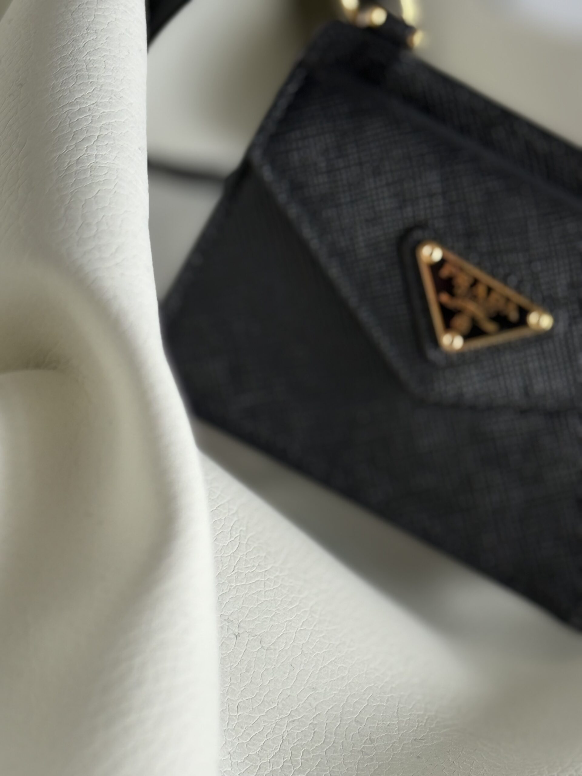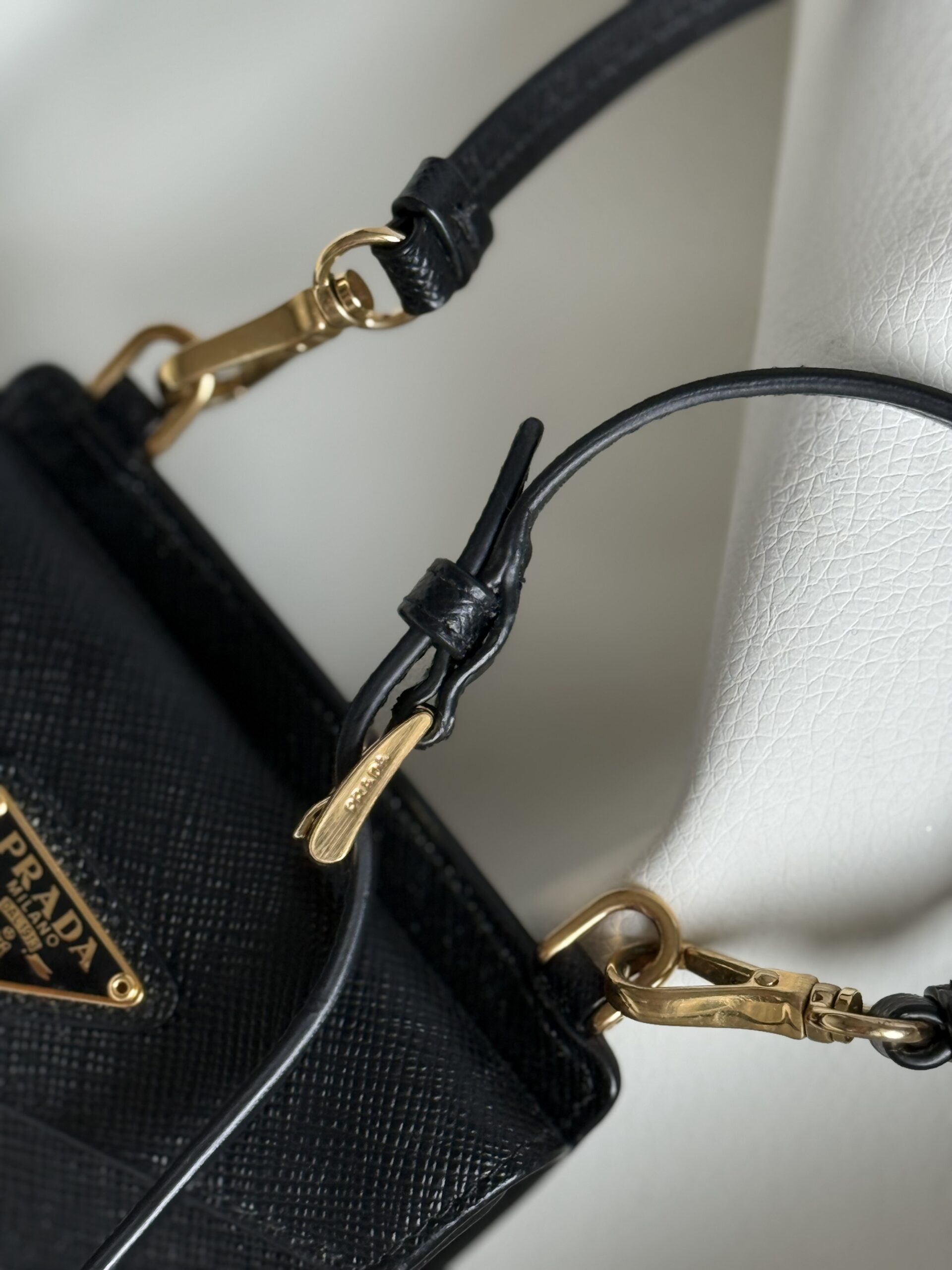 - Dettagli hardware: Metallo dorato (logo triangolare, moschettoni, anelli)