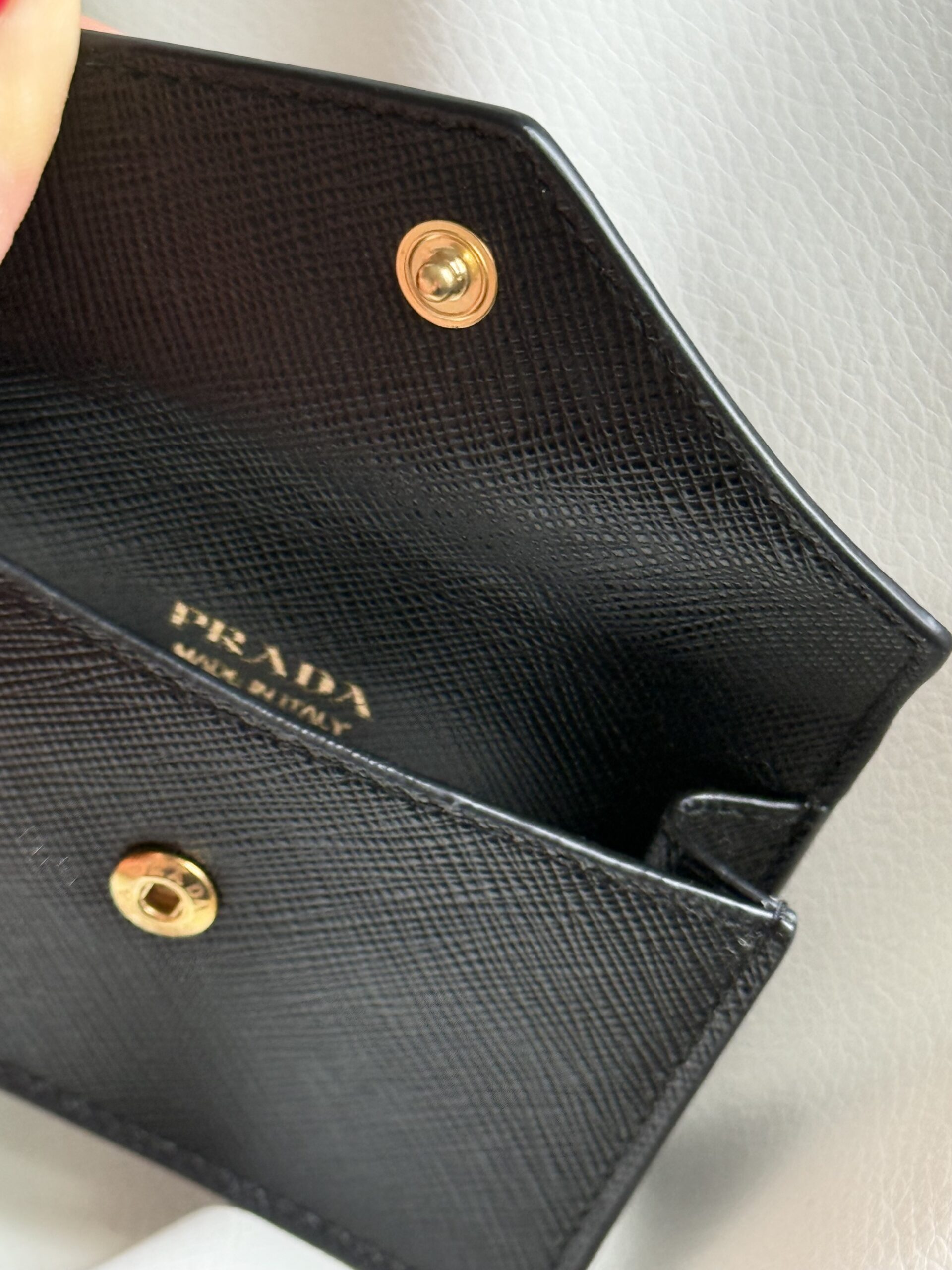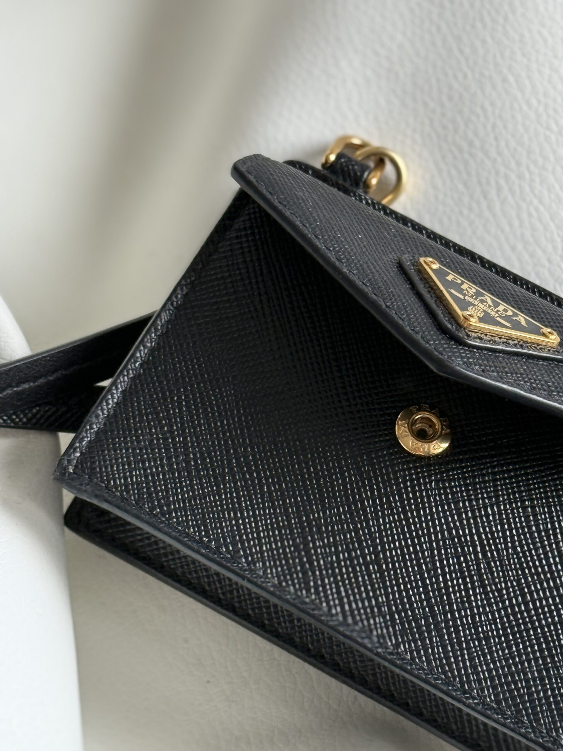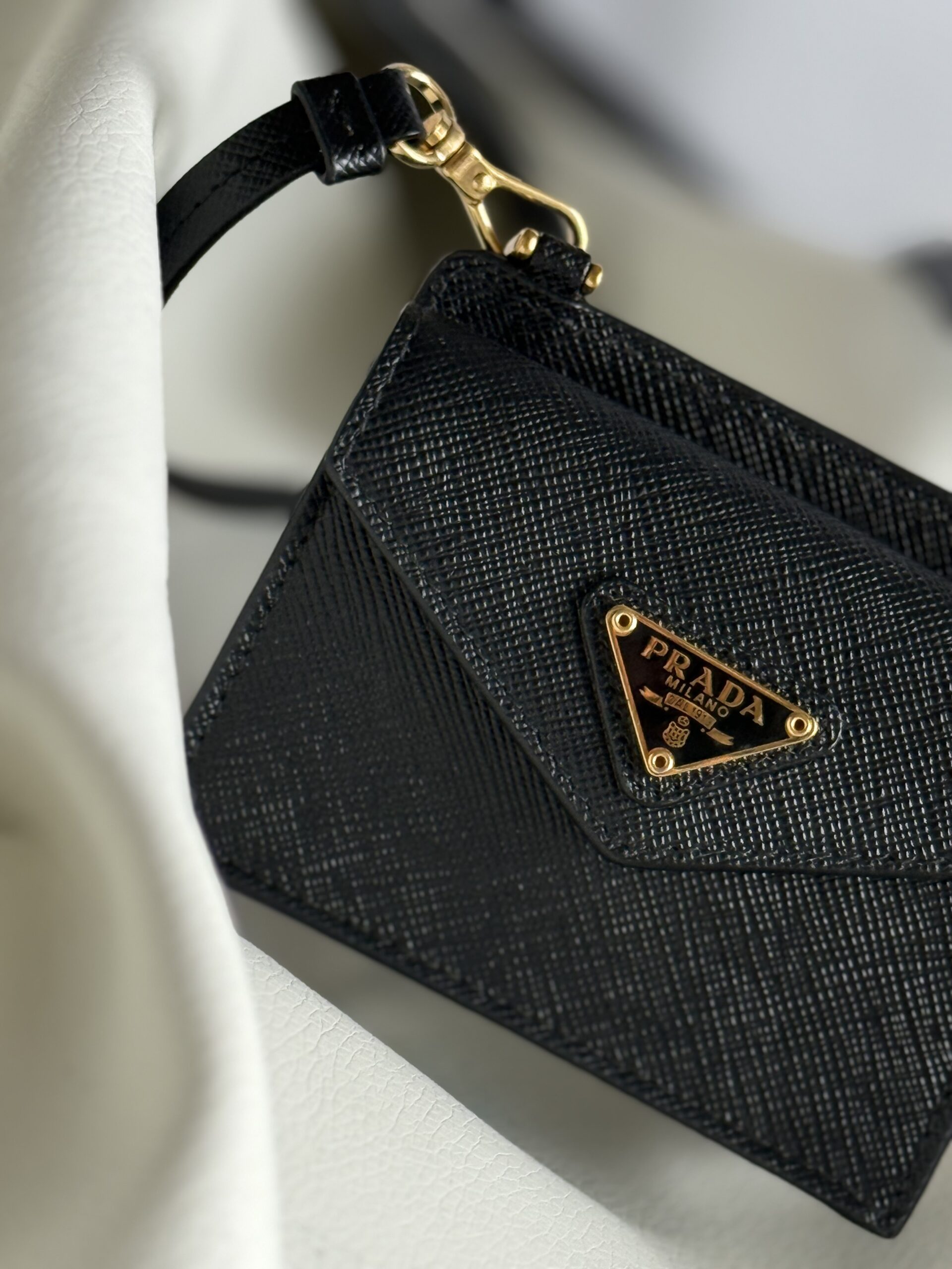 - Dettagli hardware: Metallo dorato (logo triangolare, moschettoni, anelli)