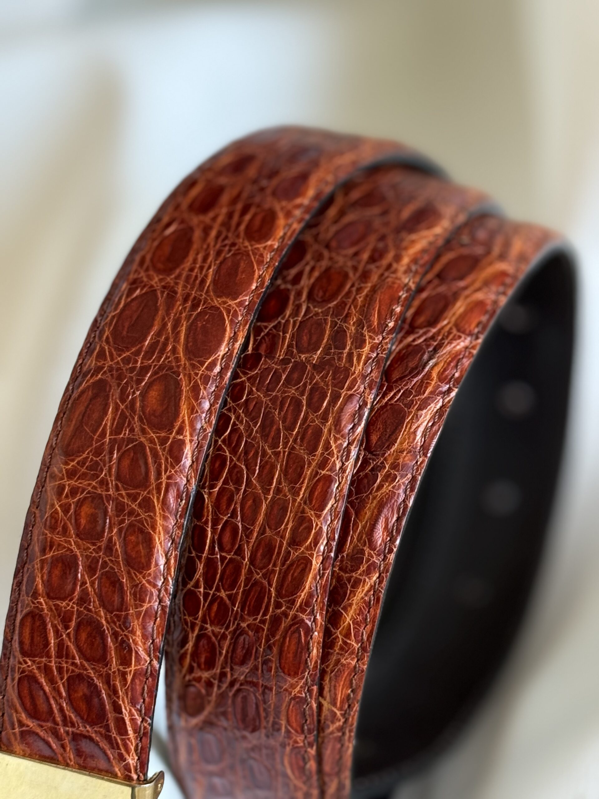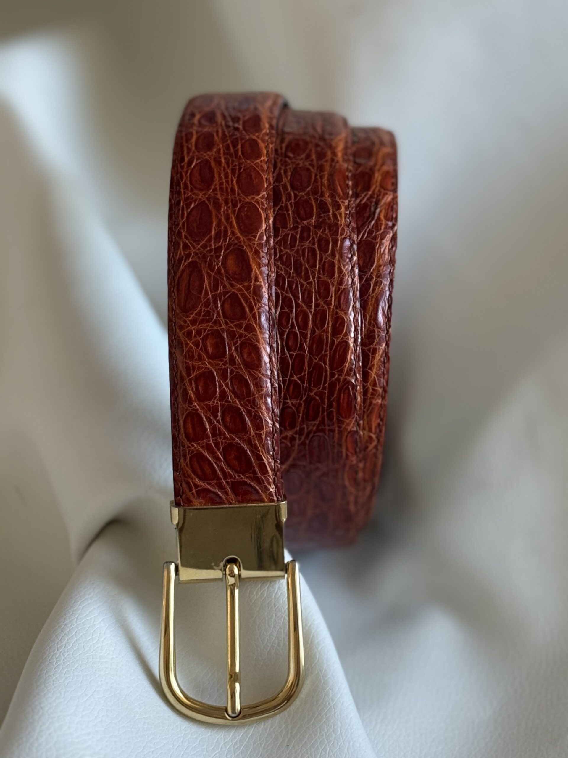 - Cintura in vero coccodrillo con texture naturale marcata e lavorazione artigianale.