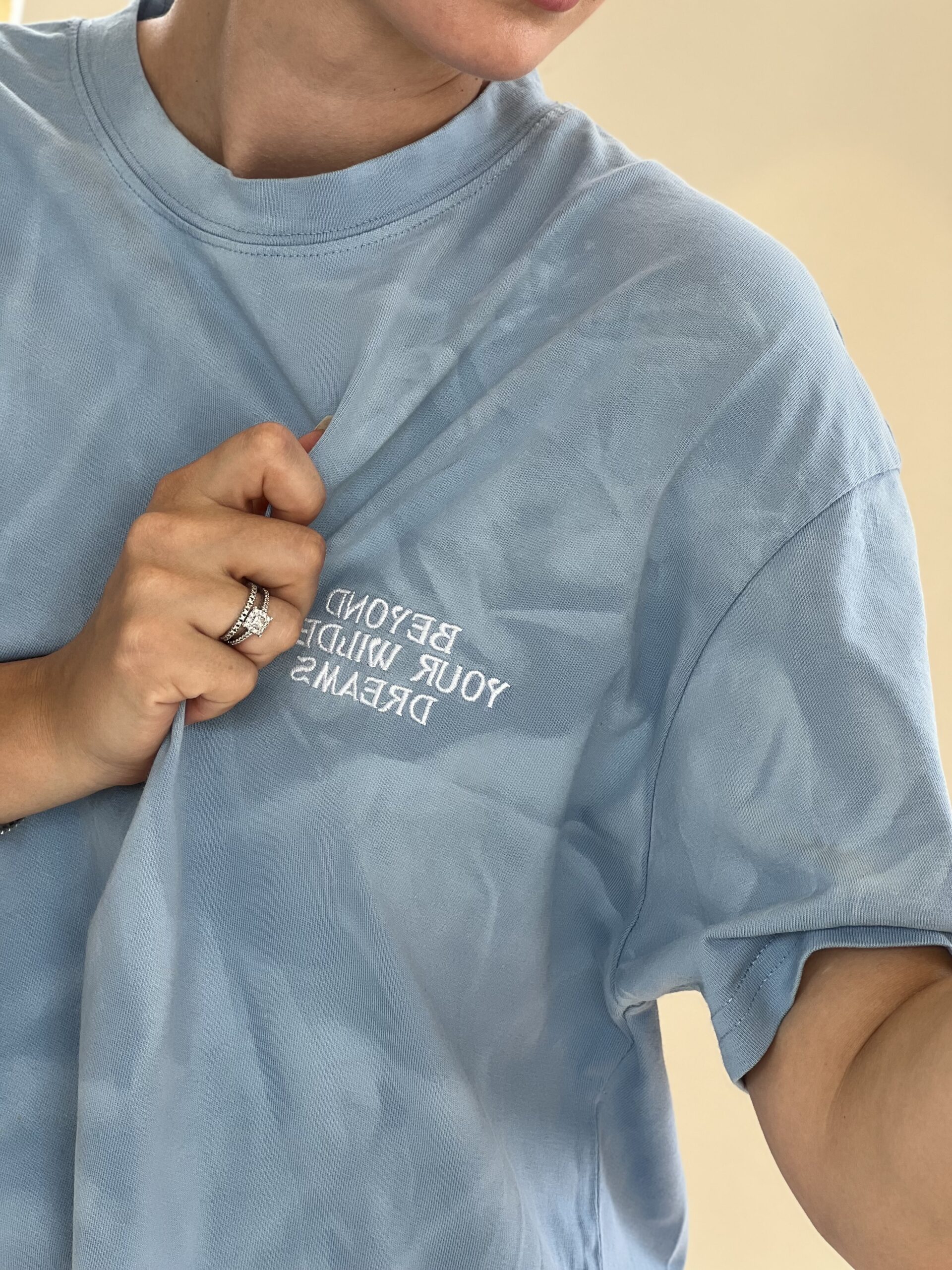 - Dettagli fronte: Ricamo bianco “BEYOND YOUR WILDEST DREAMS” sul petto